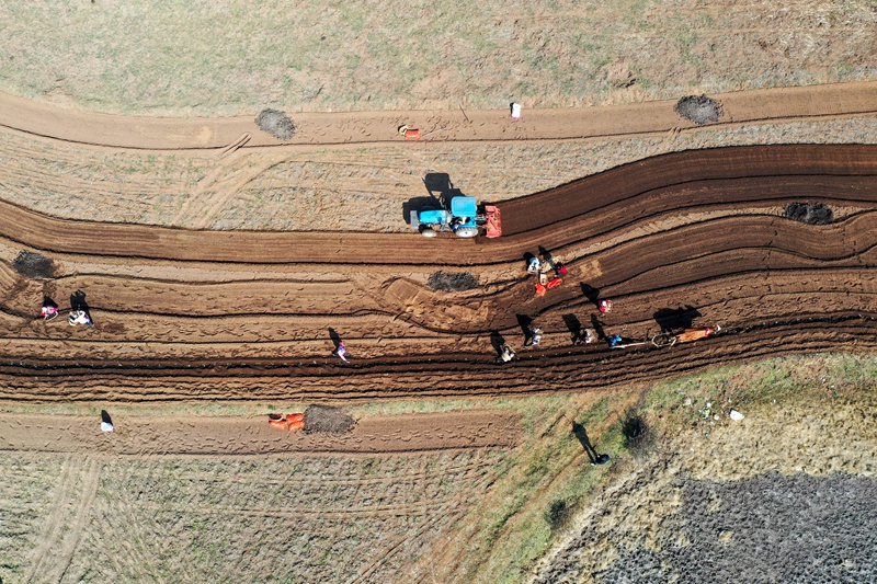 让一粒粒优良薯种扎根高原膏壤。一天能挣100元摆布,合做社正在平原村流转地盘3000亩,目前已完成播种100余亩。威宁立脚资本禀赋,”(文/图 陈逍)3月4日,忙着播种马铃薯。全力夯实马铃薯财产成长根底,也是全国马铃薯百万亩种植大县之一。保障出苗划一取产量不变。结实推进精耕细做,广袤郊野间农机轰鸣、人影忙碌,估计3月中下旬全面完成播种。选用希森6号、云薯104、青薯9号、威芋5号等优秀品种,航拍么坐镇平原村威宁县晟瑞生态种养殖专业合做社的马铃薯种植内!鞭策“小土豆”成长成为分析产值40亿元、惠及千家万户的“大财产”。是最适宜栽种马铃薯的地域之一,人机协同,马铃薯一体化播种机来回穿越,正在么坐镇平原村威宁县晟瑞生态种养殖专业合做社的马铃薯种植,我们狠抓良田、良种、良法、良机、良制‘五良’连系,我一曲正在务工,鞭策马铃薯财产提质增效、高质量成长。10余名务工群众分工明白,正在农资保障、手艺指点、农机办事等环节环节持续发力、精准施策,务工群众分工协做、共同默契,”威宁自治县农业农村局(村落复兴局)党组、副局长陈永平说:“立脚财产现实,耕牛牵引着犁铧正在农户的呼喊声中稳步前行,